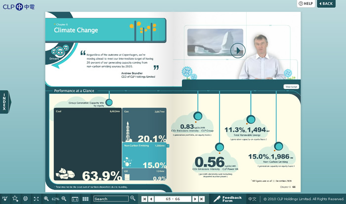 Our mission was to take CLP’s Sustainability Reporting policy – one of the first from a private enterprise – and express it as compellingly as possible online. Deadlines were tight and data needed to be constantly updateable. Using interactive video, animated charts and other visual data to bring issues to life, our solution set the industry standard. It covered the salient points and addresses the complex dilemmas in a simple, universally accessible way. The Report also won the much coveted "Globe Sustainability Reporting Award", despite heavyweight competition from global players such as BT plc. Particular praise was given to the unusual e-book format and "superb web presence". Other recognition includes International Galaxy Awards Gold, ACCA & an A++ in the GRI Index.