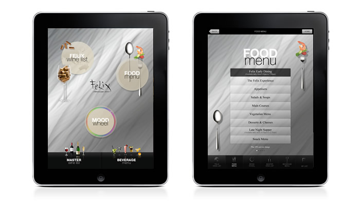 iPad menus are becoming an increasingly familiar sight in fine-dining restaurants. Our eMenu for the world-famous Felix at the Peninsula is designed to assist the sales process without taking away the all-important human service element. It allows diners to browse the menu and consider the mouth-watering photography, study the in-depth wine list, watch videos of vineyards and explore other rich media. There are food and wine pairing ideas and fun elements such as a mood wheel, which gives random menu suggestions.