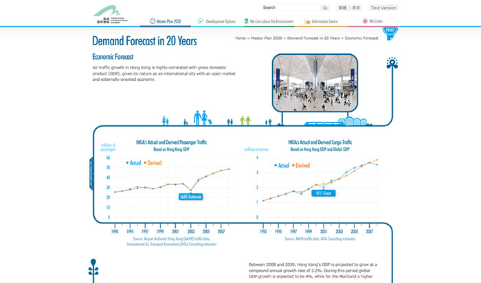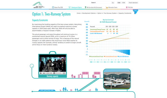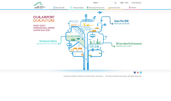 The HKIA Master Plan 2030 is highly significant to every HK resident. As such, its website was major project, almost two years in the making and implemented in total secrecy. The new site describes the Airport Authority’s 2030 Master Plan in the light of air traffic projections and growth strategy for the next two decades. It also details the key decisions that Hong Kong people will have to make, such as whether a third runway should be built - and addresses the broader environmental issues. In keeping with the principles of consultation, the site is dedicated to generating public feedback on alternative schemes.
