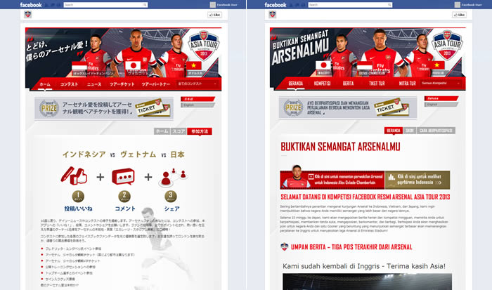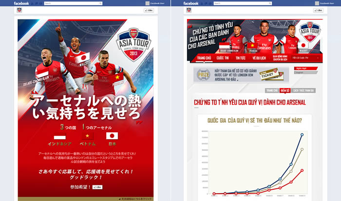 Our ‘Prove Your Arsenal Passion!’ Facebook App to support Arsenal’s Asia Tour visiting Japan, Vietnam and Indonesia, was a first. It appeared in Japanese, Vietnamese and Bahasa. The campaign generated nearly 45,000 visitors, 10,000 app users and nearly 3000 competition responses. It brought together the Arsenal community in Asia, encouraged them to generate content, drove competition between the three countries, kept them updated with game information – and provided great prizes like a visit to London to see the team play. Content is hosted in the “Windows Azure” Cloud to support regional requirements – another first. Designercity have worked with Arsenal since the mid 90s.
