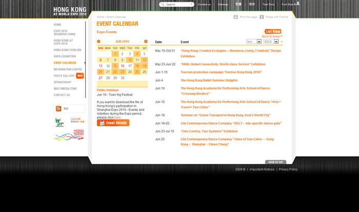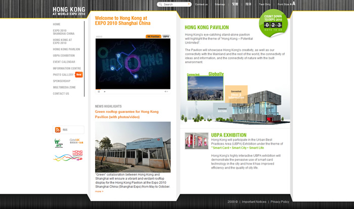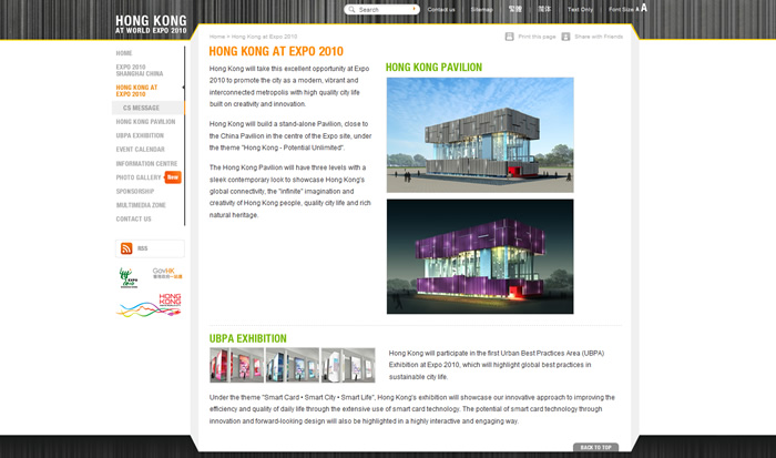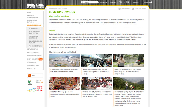 Our challenge was to communicate the excitement and dynamism of Hong Kong and the HKSAR Expo 2010 building to potential visitors, and the millions around the world who will visit the event virtually. Based on three cornerstones: Connected Globally, Connected (via) Ideas and Information and the Connectivity (of) Nature with the Built Environment, the website mirrors the distinctive appearance and messaging of the HKSAR Expo 2010 Pavilion, "Hong Kong - A City with Unlimited Potential". The site reflects Hong Kong’s dynamic aspirations and, crucially, is designed to cope with the huge site traffic and interest commanded by the Expo. There is also a Mobile version.